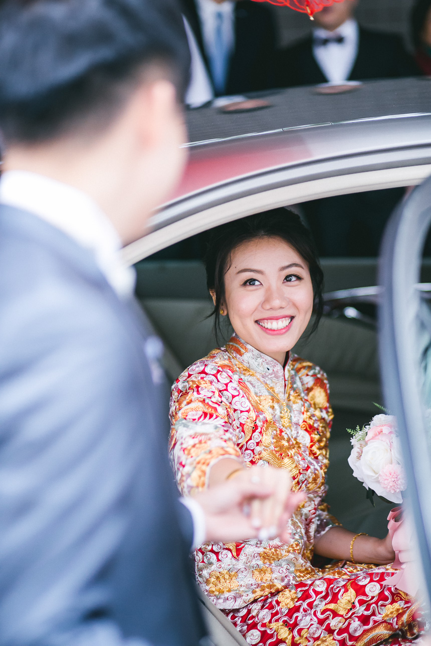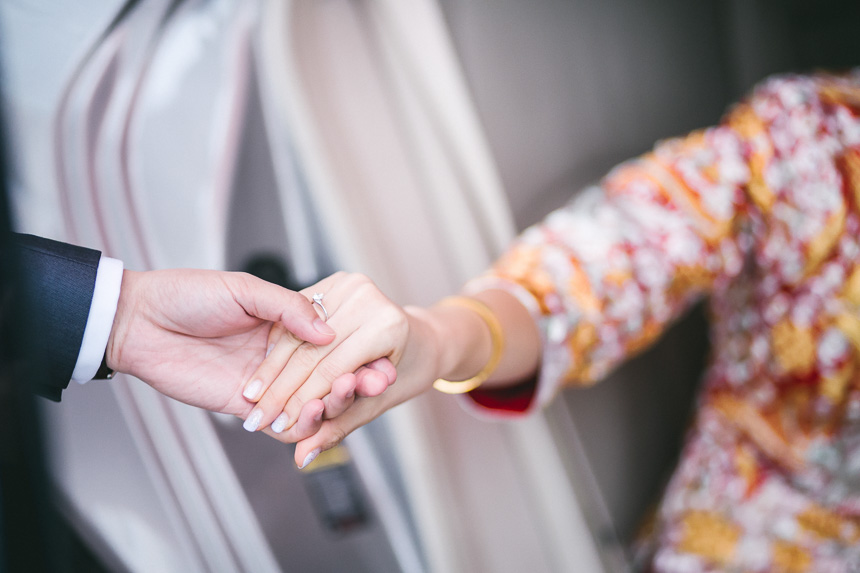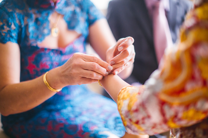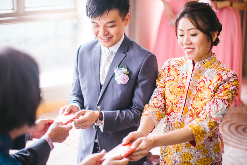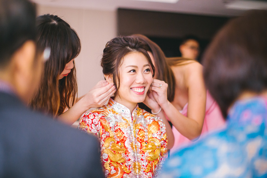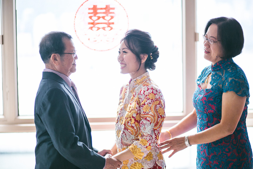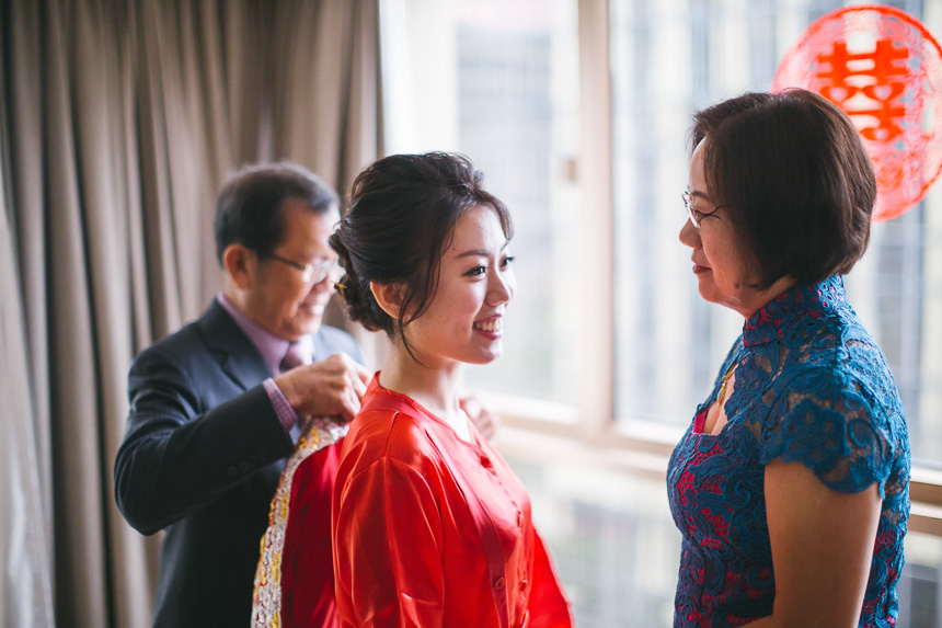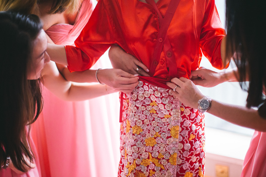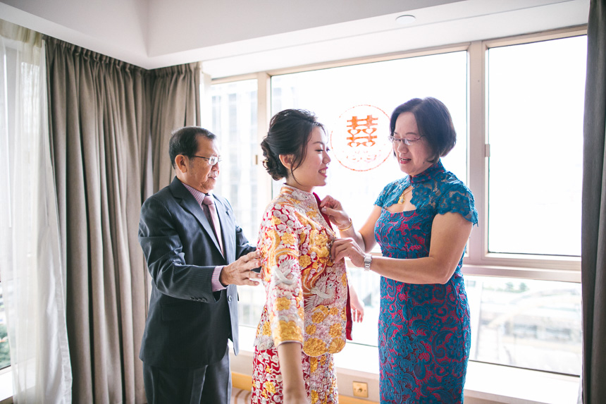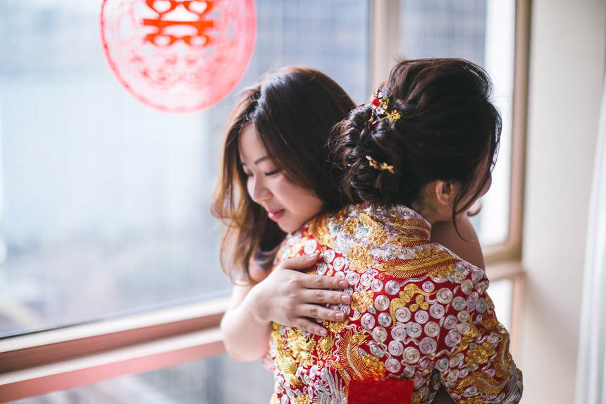 The makeup artist was scheduled to arrive at the Royal Garden nice and early at 6:15am. Renee had 6 bridesmaids and they all arrived and hour later so they could all get ready together. All the bridesmaids helped Renee in to her Chinese Kua before her parents came in to apply the finishing touches. As with most weddings we photograph this resulted in some lovely emotional shots.